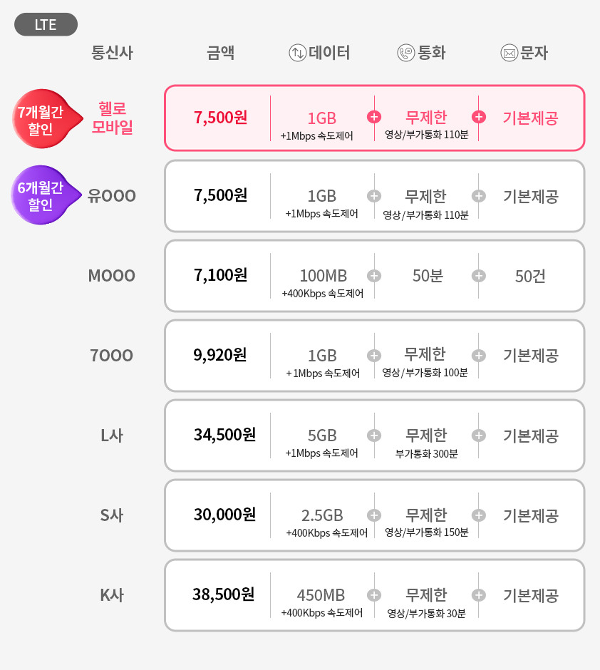 - 데이터: 7GB + 1 Mbps
