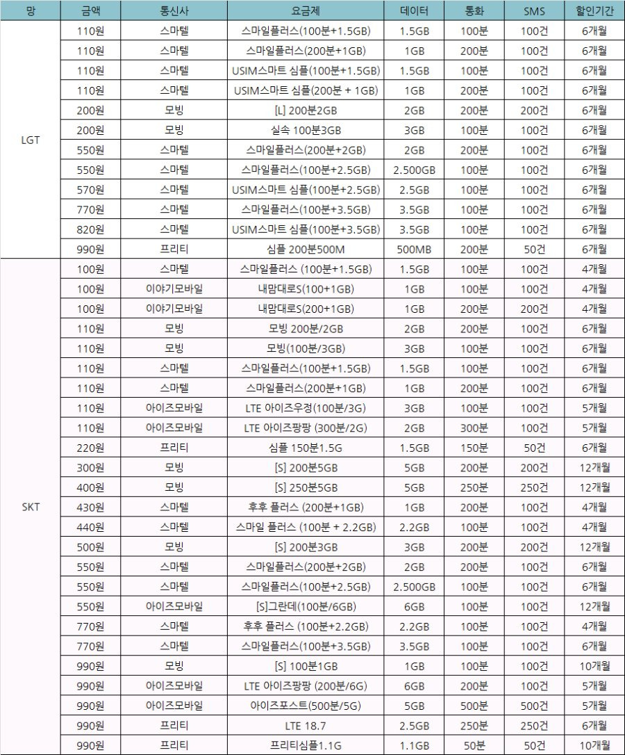 - LGT망: 에이모바일 A 갓성비 1GB+/100분 요금제