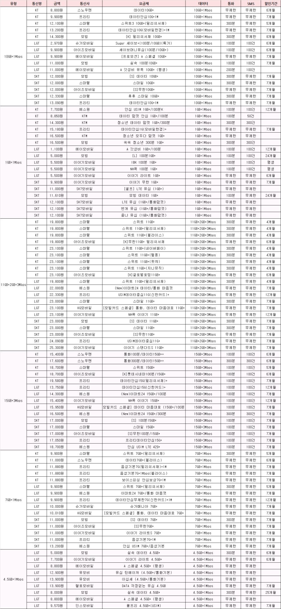 - 데이터: 11GB + 2GB + 3 Mbps