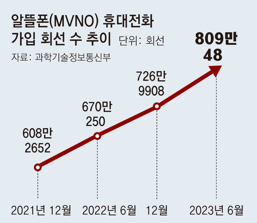 알뜰폰 통신사는 2024년 현재 80여 개에 달하며, 알뜰폰 가입자 수는 1,000만 명을 돌파할 것으로 예상됩니다. 과학기술정보통신부의 무선통신서비스 통계에 따르면, 2024년 3월 기준으로 누적 휴대폰 가입 회선 수는 5,673만 회선에 이르며, 그중 알뜰폰 회선 수는 917만 명으로 전체의 16%를 차지하고 있습니다.