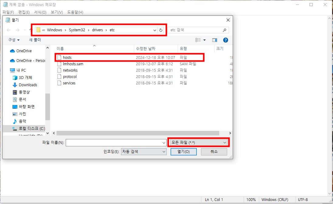 C:\Windows\System32\drivers\etc폴더로 이동합니다.- 아래쪽의 파일 형식을 "모든 파일"로 변경한 후,