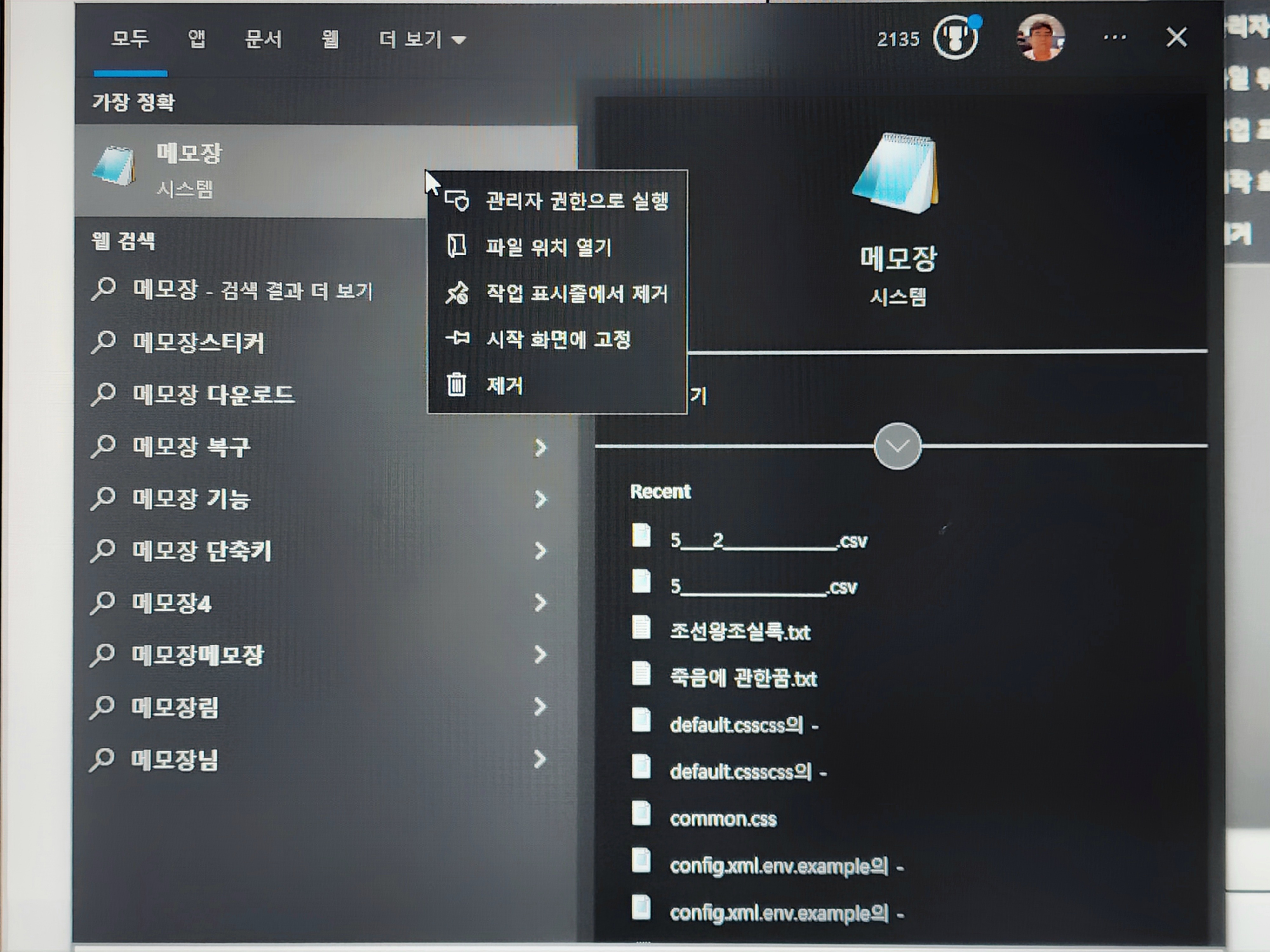 - 시작 메뉴에서 "메모장"을 검색한 뒤, 마우스 오른쪽 버튼을 클릭하여 "관리자 권한으로 실행"을 선택합니다. 관리자 권한을 통해 시스템 파일에 접근할 수 있어야 설정을 변경할 수 있습니다.