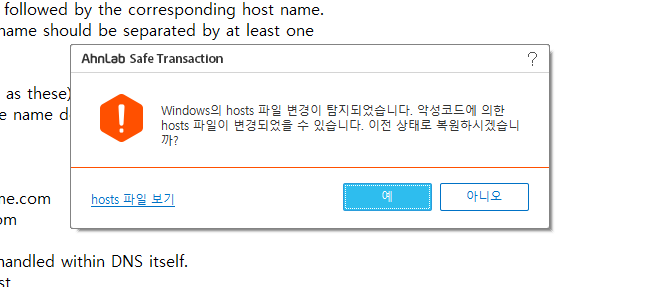 복원하면 안 됩니다. 그럼 그냥 호스트파일이 원래대로 돌아갑니다. 당연히 "아니오"를 선택하셔야 합니다.