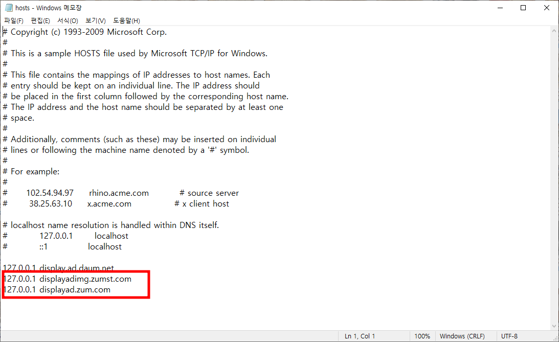 127.0.0.1 display.ad.daum.net- 처음에 설명한 것처럼 위 코드를 hosts 파일에 넣어주세요.