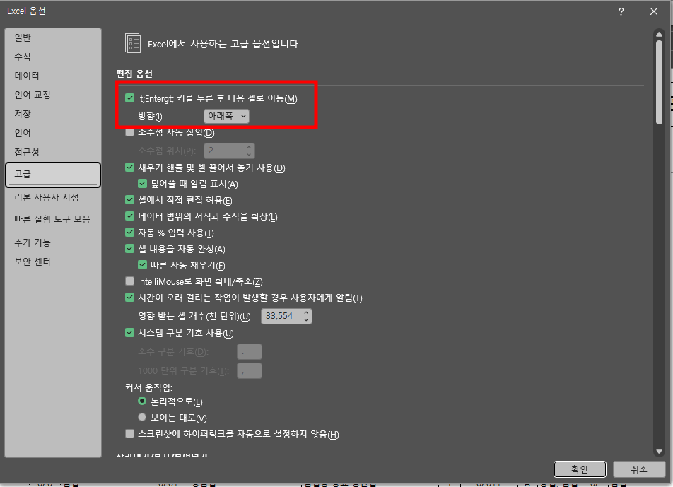 - 체크되어 있지 않다면 체크하고, 커서 이동 방향도 설정할 수 있습니다. 기본값은 '아래쪽'이지만 원하는 방향으로 변경할 수 있습니다.