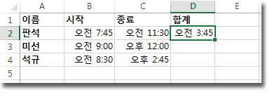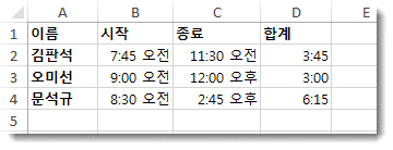 이 방법을 사용하여 여러 사람의 작업 시간을 계산할 수도 있습니다. 예를 들어, 김판석, 조이, 레슬리가 각각 다른 시간에 작업을 시작하고 종료했다고 가정해 보겠습니다.