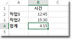 결과적으로 B4 셀에는 16:15가 표시되며, 이는 두 작업을 완료하는 데 총 16시간 15분이 걸린다는 것을 의미합니다.