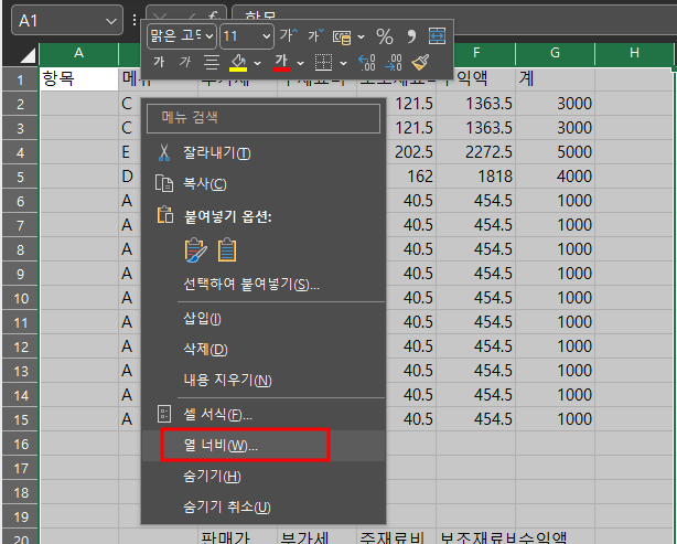 마우스로 엑셀 열 너비 조절하기