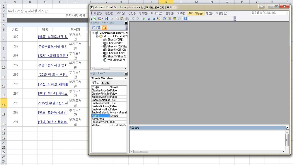 - VBA 창에서 Ctrl+G를 눌러 직접 실행 창을 띄웁니다.