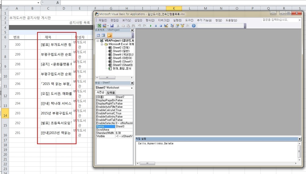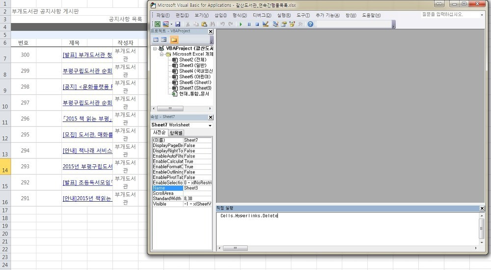 Cells.Hyperlinks.Delete를 입력하고 엔터를 누르면, 현재 시트의 모든 하이퍼링크가 일괄 삭제됩니다.