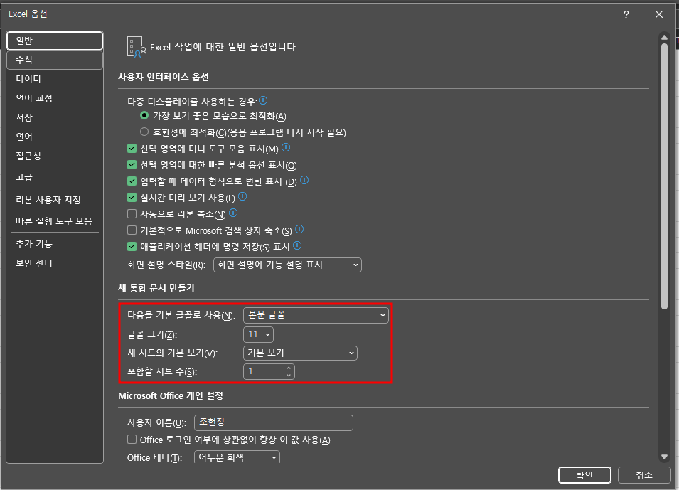 - ‘새 통합 문서 만들기’ 항목 내에서 기본 글꼴과 글꼴 크기 지정