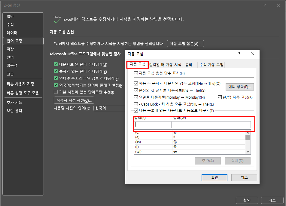 - ‘자동 고침’ 탭에서