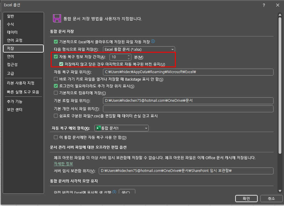 - ‘자동 복구 정보 저장 간격’에서 분 단위로 간격 설정 (일반적으로 3~10분 추천)