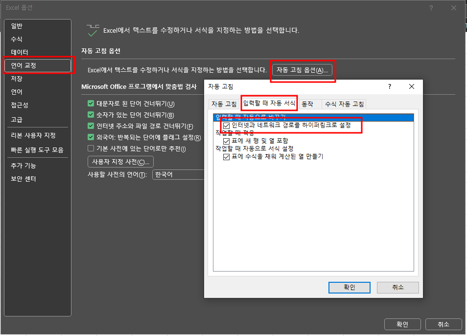 - ‘자동 서식’ 또는 ‘자동 고침’ 창에서 ‘인터넷 및 네트워크 경로를 하이퍼링크로 만들기’ 옵션 체크 해제