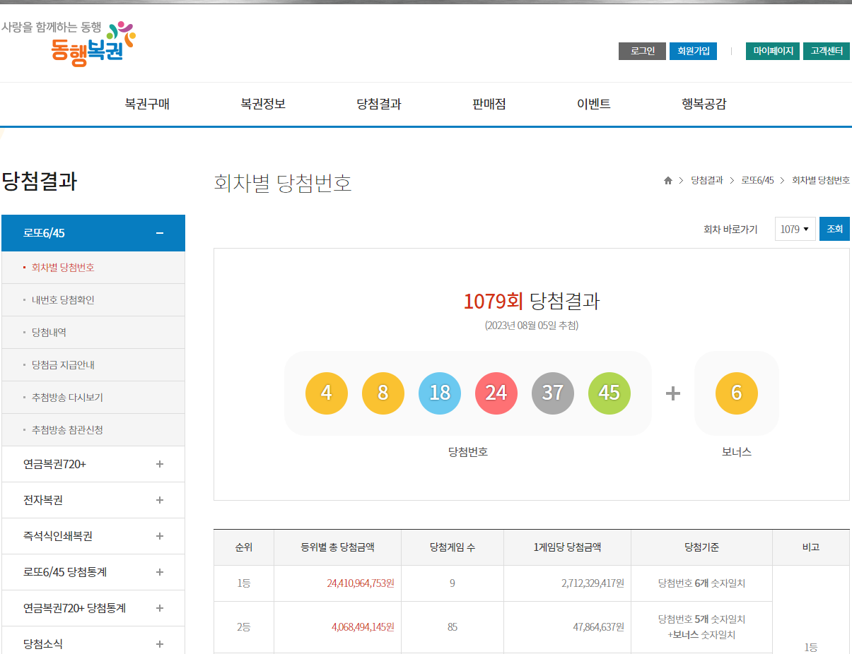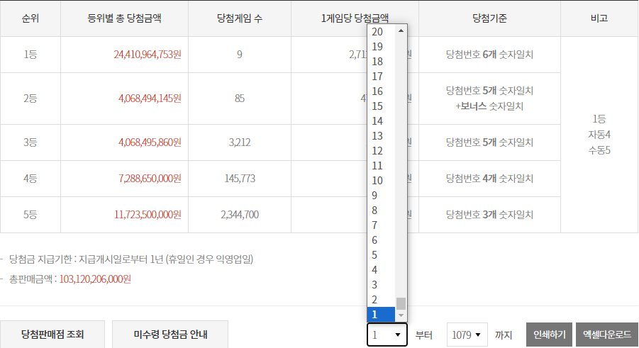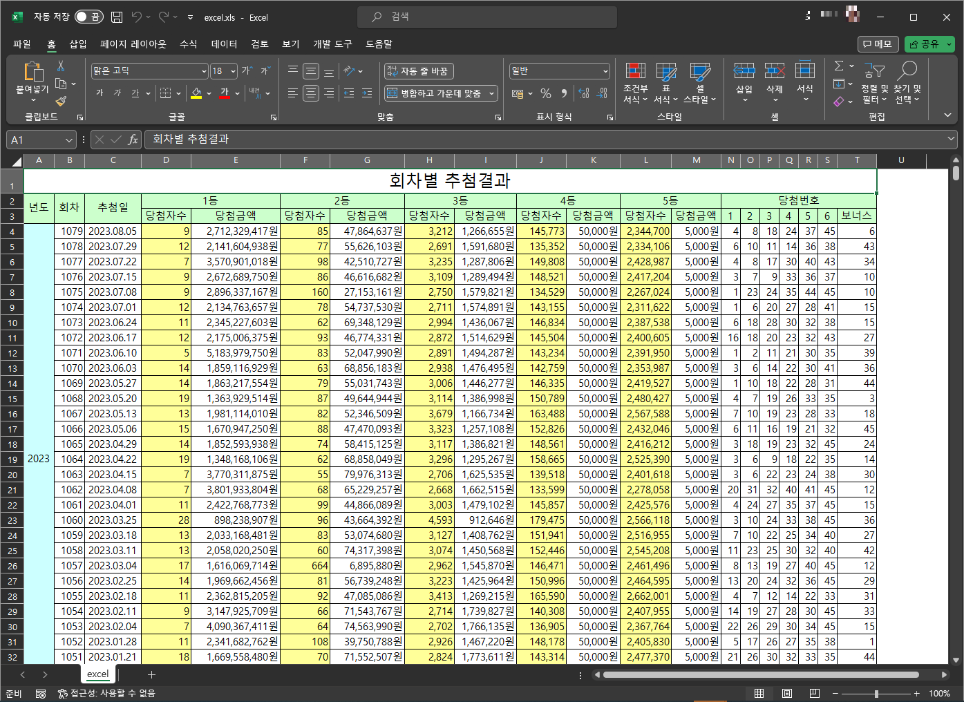 앞으로는 동행복권 사이트에서 다운로드 받으셔도 되구요. 이 글에 매번 업데이트를 해두도록 하겠습니다. 일단은 오늘 추첨결과가 포함된 1회부터 1079회 로또당첨번호 전체모음 엑셀 파일을 첨부해두겠습니다. 당연히 역대 로또1등당첨번호 목록이겠죠?