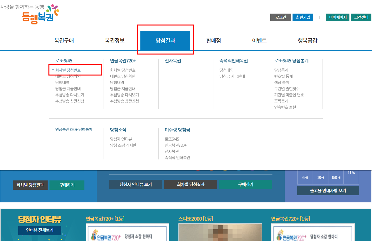 웹사이트의 중앙에 위치한 '당첨결과' GNB에 마우스를 올리면 GNB가 펼쳐집니다. '로또 6/45'의 '회차별 당첨번호' 메뉴를 클릭합니다. 이 섹션에서는 로또 당첨번호와 관련된 정보를 제공합니다. 당첨결과 메뉴만 클릭해도 '회차별 당첨번호'로 바로 갑니다.
