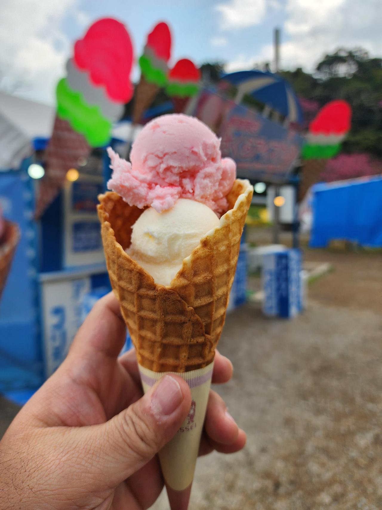 야에다케 공원 중턱 쯤에 위치한 공터에는 주차할만한 공간과 블루실 아이스크림을 파는 노점과 꽃을 파는 꽃 노점이 있었습니다. 아마 주말이나 축제기간에는 푸드 트럭들도 올 것 같습니다.