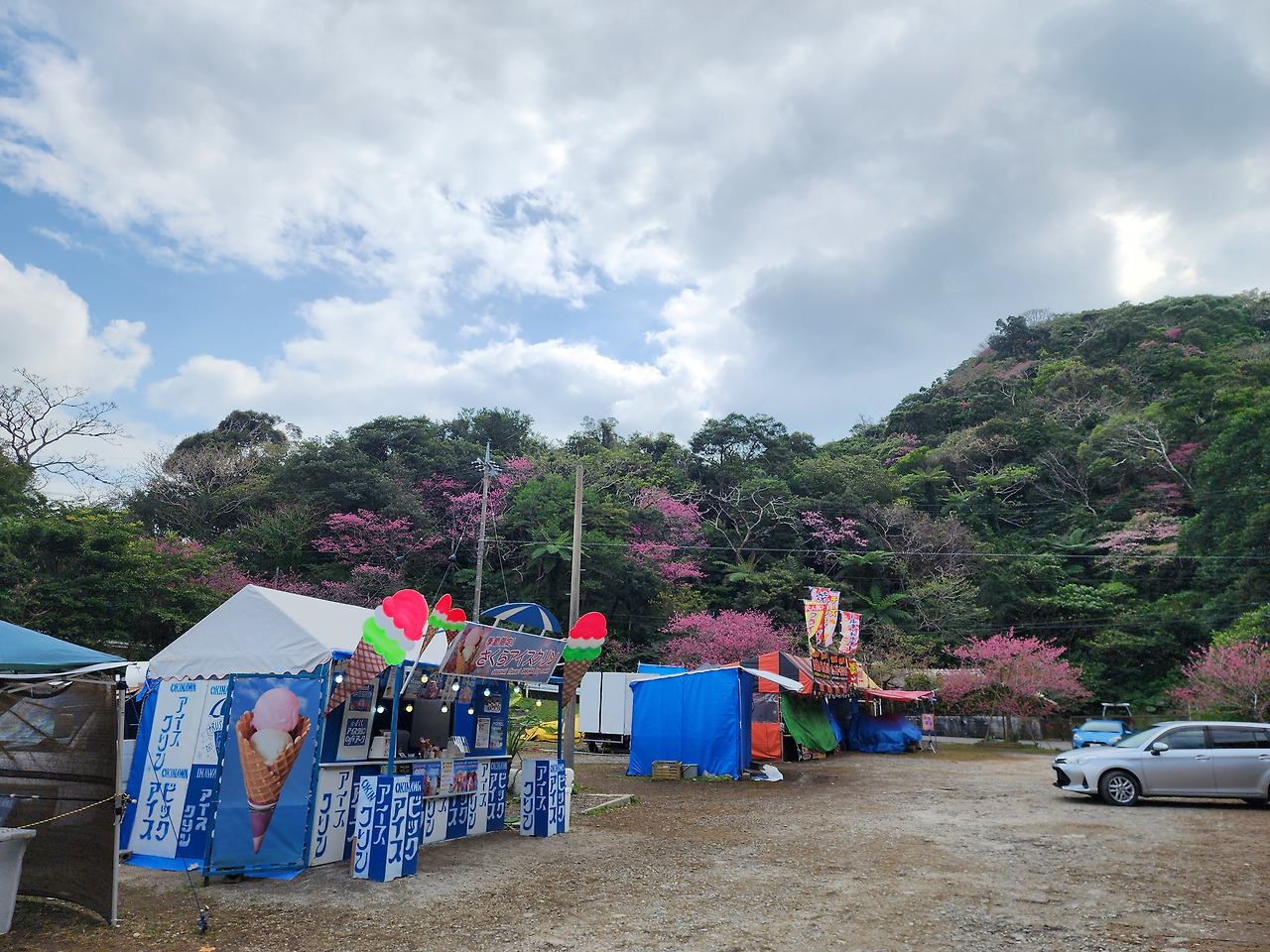 야에다케 공원 중턱 쯤에 위치한 공터에는 주차할만한 공간과 블루실 아이스크림을 파는 노점과 꽃을 파는 꽃 노점이 있었습니다. 아마 주말이나 축제기간에는 푸드 트럭들도 올 것 같습니다.