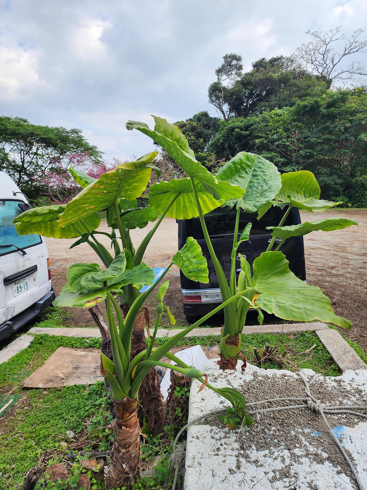 오키나와에는 어디에서나 바나나 나무를 흔하게 볼 수 있습니다. 그냥 잡초처럼 자라나 있습니다. 야생에 널렸죠. 저게 진짜 야생바나나인지는 모르겠습니다만, 주인이 가꾸는 바나나 나무는 아닌 게 분명해 보입니다. 그리고 오키나와 나하 공항에서부터 길거리에 지천으로 널려 있는 토란 잎 같은 식물은 놀랍게도 알로카시아입니다. 야에다케 공원에 벚꽃나무 말고도 이런 바나나와 알로카시아 나무도 지천으로 널려 있습니다. 토란같이 생긴 게 아니라 토란 속 식물이기 때문에 토란처럼 생겼습니다. 대신 원래 토란도 독성이 있듯이 알로카시아도 독성이 있습니다. 물론 토란보다 좀 더 강합니다. 먹으면 죽을 수도 있습니다.
