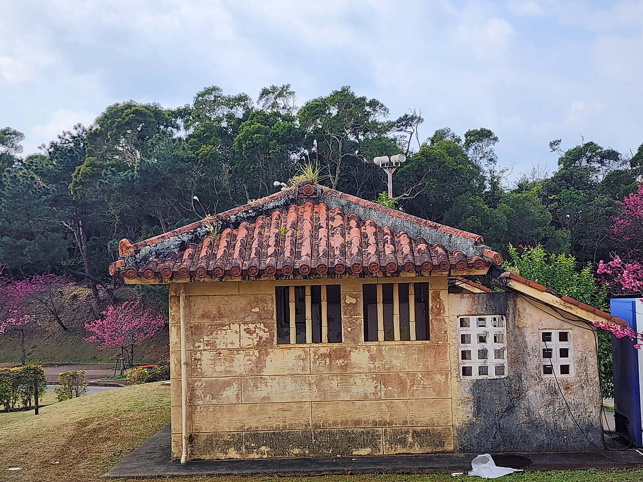 왜인지 모르겠지만, 오키나와 산신령이라도 나올듯한 건물입니다. 지붕에 잡초를 키우는 게 오키나와 국룰인가 봅니다.