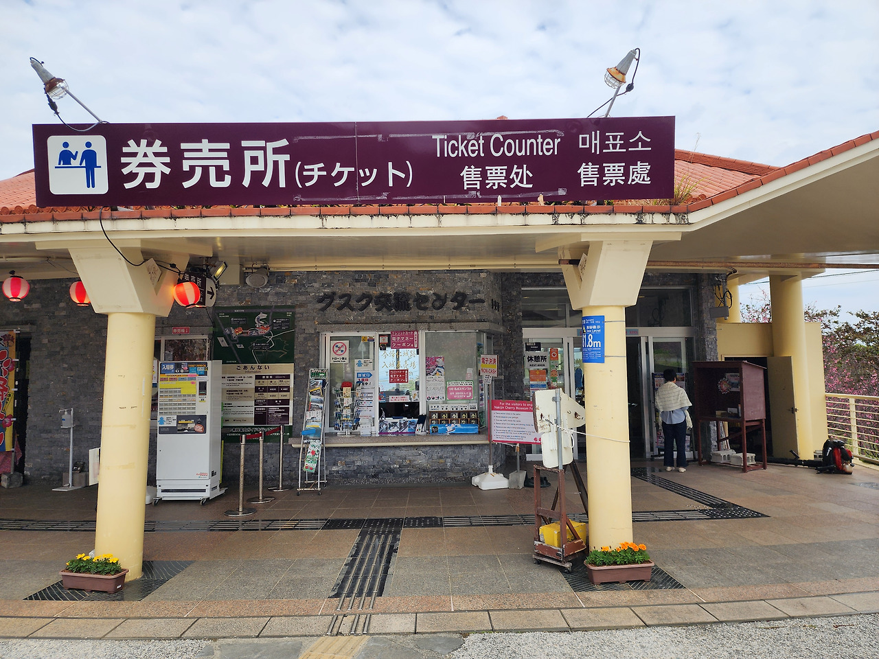 입구 앞에 매표소가 있습니다. 화장실도 있고, 카페도 있으며, 기념품샵도 있습니다. 나키진 성터 입장료는 1인당 600엔입니다. 만좌모 입장료가 100엔인 것에 비하면 꽤 비싼 편이지만, 그 정도 지불할 가치가 있습니다.
