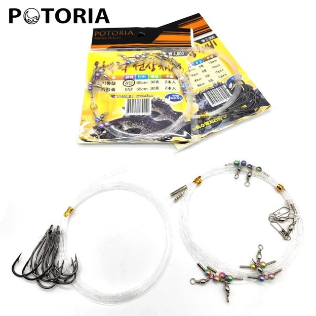 - 봉돌 윗부분에 20 cm 간격으로 2단 지선(카본 4 ~ 5호) 연결, 무미늘 바늘 9 ~ 10호 사용