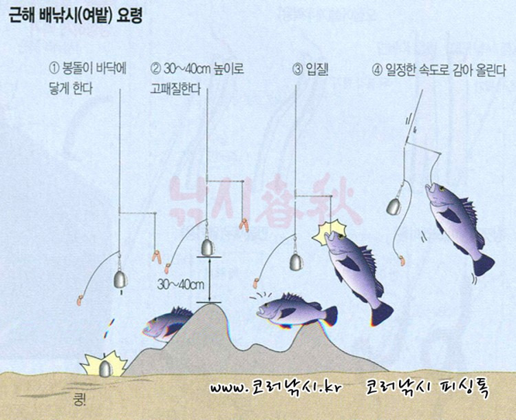 - 1차 탐색: 봉돌 바닥 찍고 1 ~ 2 m 권역에서 상하층 수직 훑기