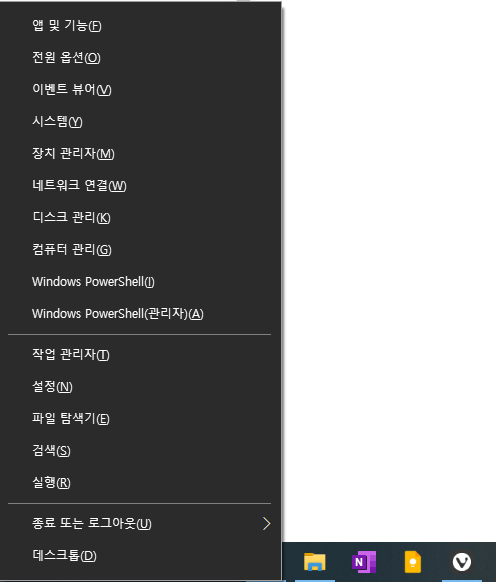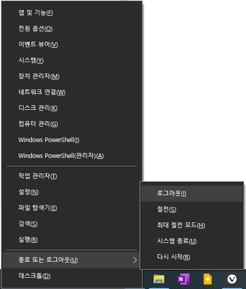 Windows + X키를 동시에 누릅니다.U키를 누릅니다.H키를 누릅니다.