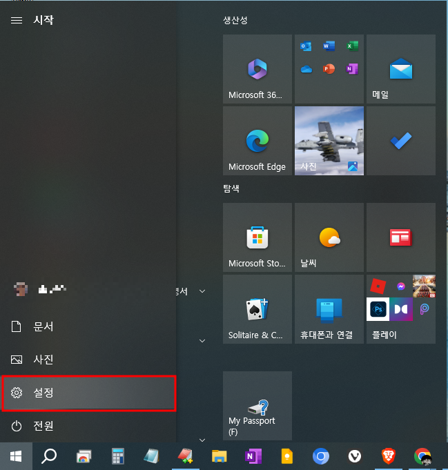 시작버튼을 클릭한 후설정(톱니바퀴 아이콘)을 선택합니다.