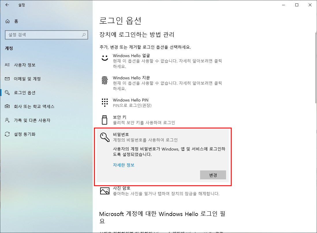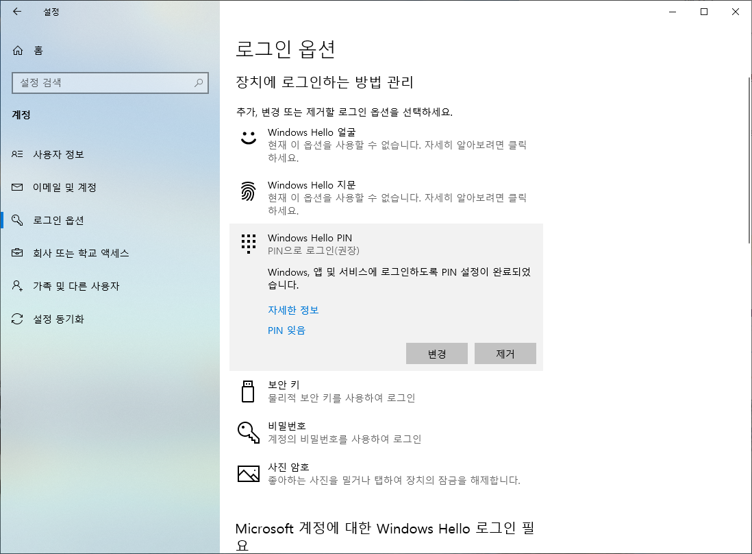앞서 설명한 pin 제거와 동일한 결과지만, 접근 방법이 다른 것을 조금 소개하기 위한 설명입니다. 윈도우 10 비밀번호 변경은 글 끝을 보시면 됩니다.