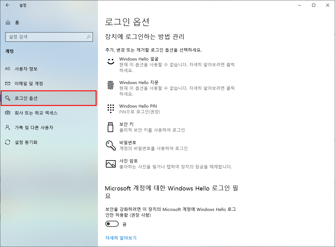 - 계정 설정 열기: '계정'을 선택한 후, '로그인 옵션'을 클릭합니다.