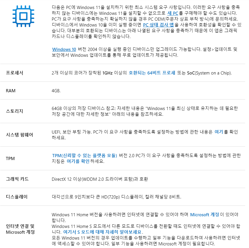 윈도우11은 보안 강화와 안정성 확보를 이유로 다음과 같은 최소사양을 요구합니다.