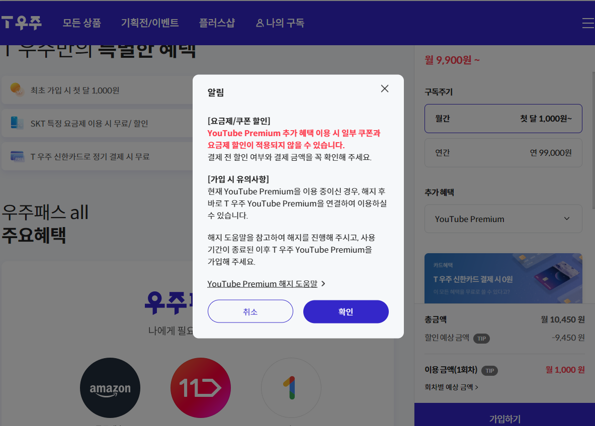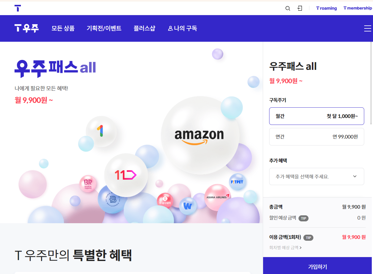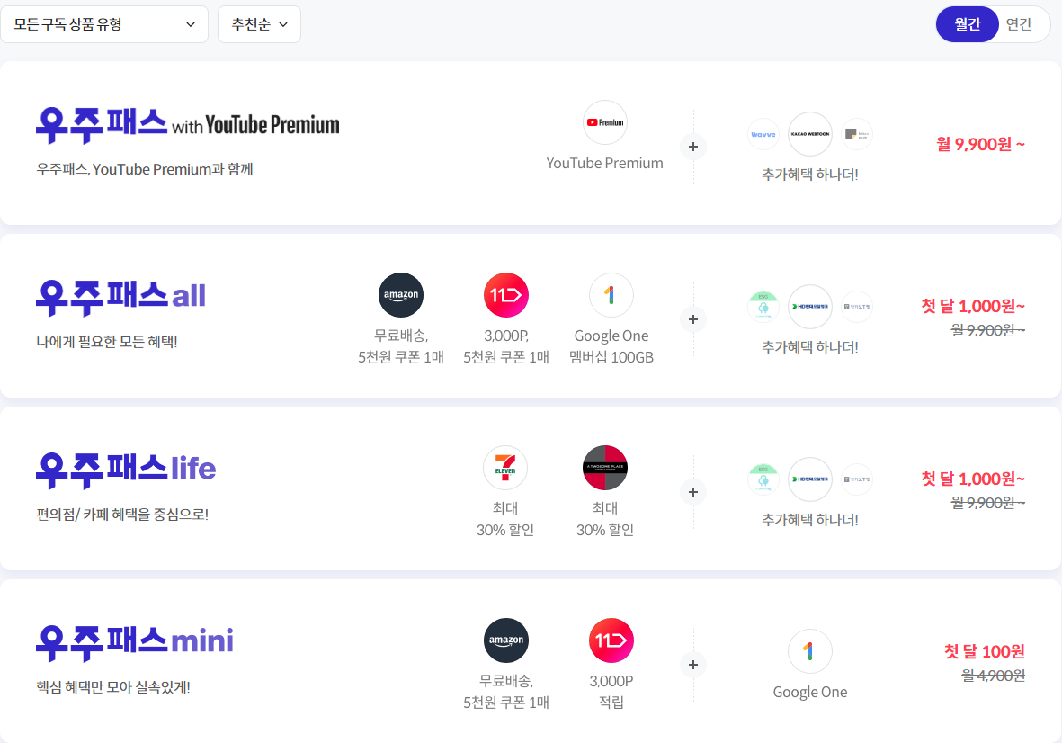 - 우주 패스 all 혜택: 아마존 5천 원 쿠폰, 11번가 3,000P+5,000원 쿠폰, Google One 100GB 등, 550원 추가 시 유튜브 프리미엄을 이용할 수 있음.