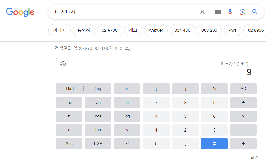 하지만 일단 구글이든 네이버든 다음이든 포털에 저 수식을 넣기만 해도 답은 9로 나옵니다.