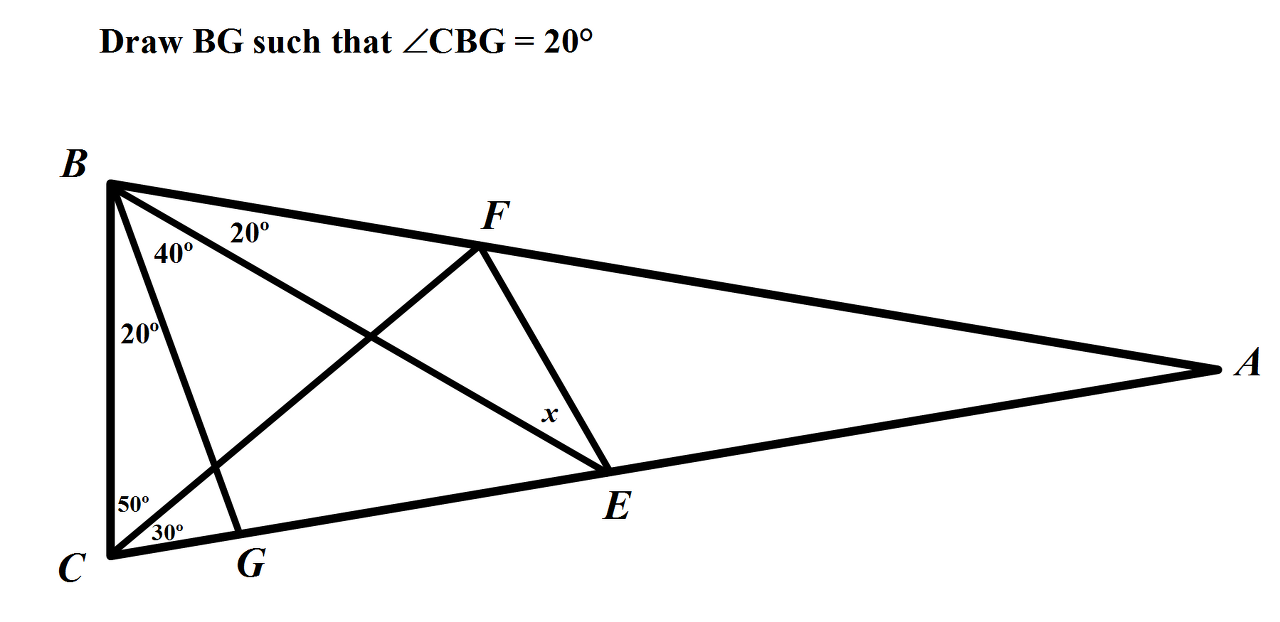 - 이제, ce와 만나는 점을 g라고 이름 붙여봅니다. gbc라는 각을 찾아보면, gbc는 이등변 삼각형의 등각 중 하나이므로 80도가 됩니다.