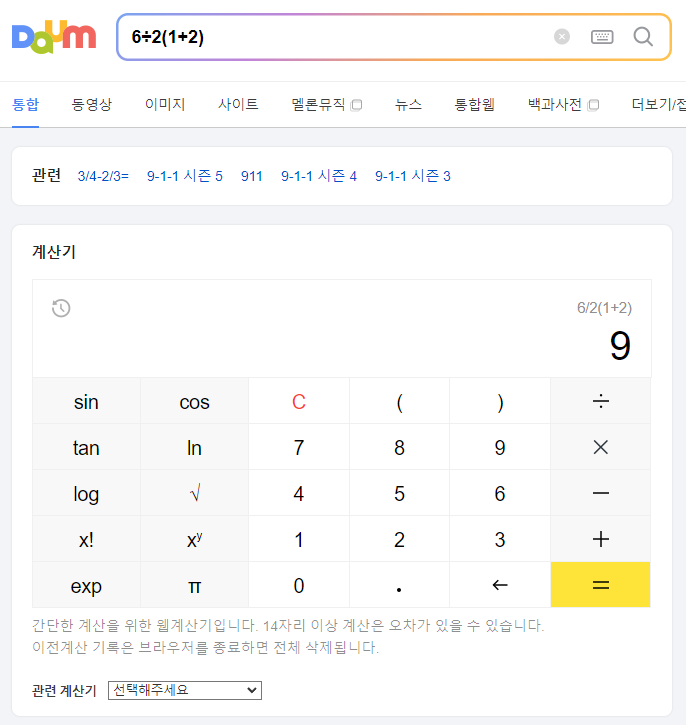 하지만 일단 구글이든 네이버든 다음이든 포털에 저 수식을 넣기만 해도 답은 9로 나옵니다.
