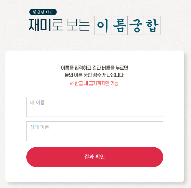 - 기획 의도: 한글날을 기념해 이름으로 친밀도와 호감도를 ‘재미로’ 확인해보는 인터랙티브 페이지