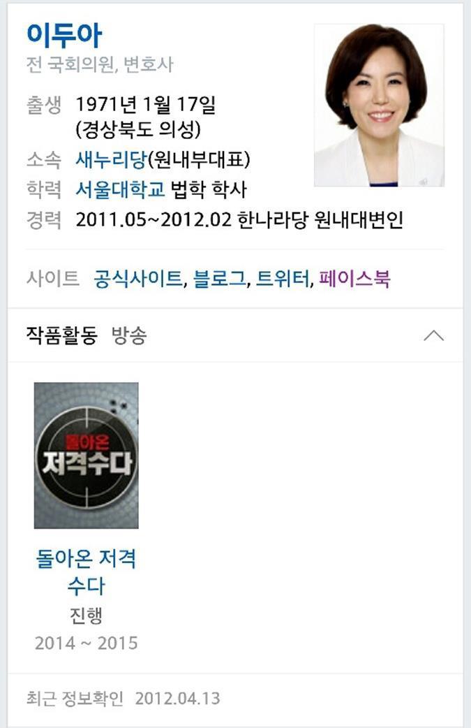 변호사인 이두아는 주로 범죄 관련 뉴스의 자문을 맡는다. 그녀의 다른 직함은 이두아 전의원으로, 새누리당 부원 내대표이다. 과거 비례대표로 잔여임기 동안 국회의원직을 수행하였다.