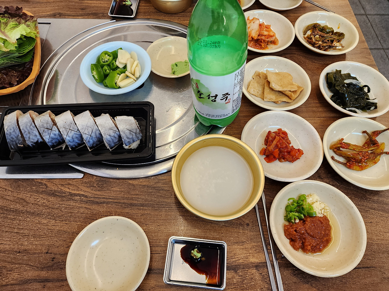 미락회양념의 기본 상차림은 깔끔하게 제공되었으며, 서림상회의 대방어 회와 함께 매운탕도 주문했습니다. 특히 매운탕의 맛이 아주 일품이었는데, 방어 서더리가 들어가 깊은 맛을 내어 매우 만족스러웠습니다. 차를 가져왔기 때문에 술은 많이 마시지 못했지만, 소성주 막걸리 한잔으로 방어회의 기름진 맛을 중화시키며 만족스러운 식사를 마무리할 수 있었습니다.