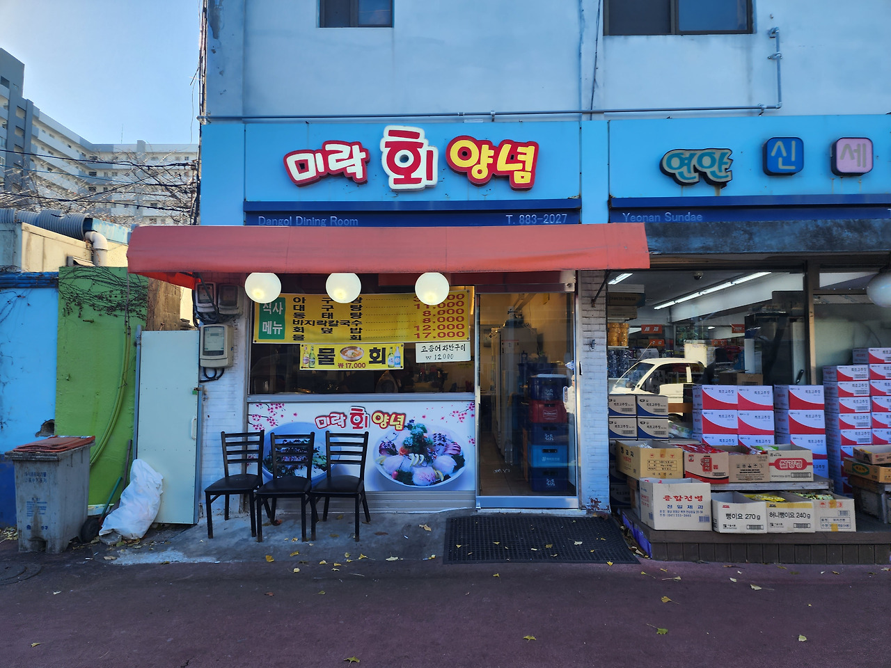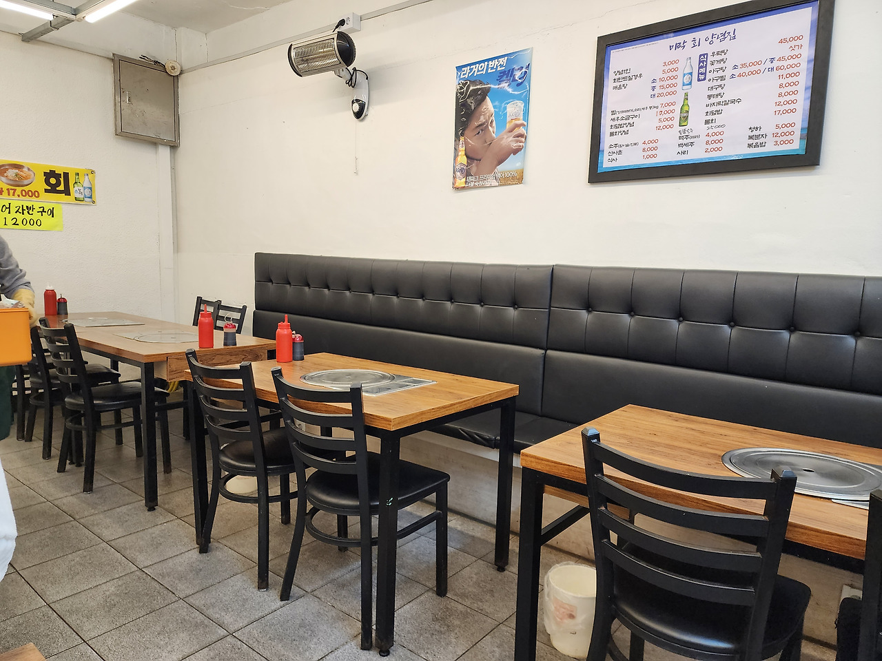 서림상회에서 방어회를 주문한 후, 미락회양념으로 이동해 본격적인 식사를 시작했습니다. 미락회양념은 인천 종합어시장 초장집으로 유명한 학생식당보다 훨씬 넓고 쾌적한 환경을 제공합니다. 평일 낮이라 손님도 적어 조용하게 식사를 즐길 수 있었습니다.