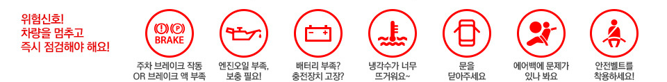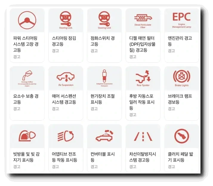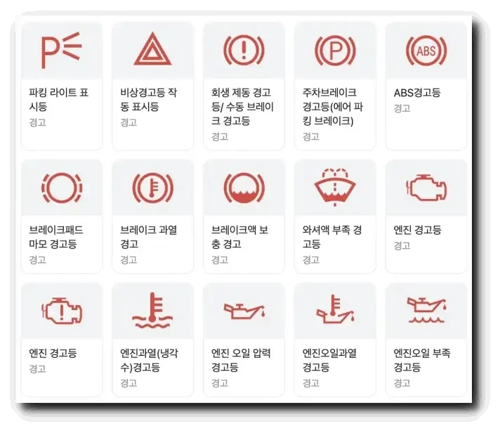 빨간색 자동차 경고등 종류 - 즉시 정차 또는 정비소 입고