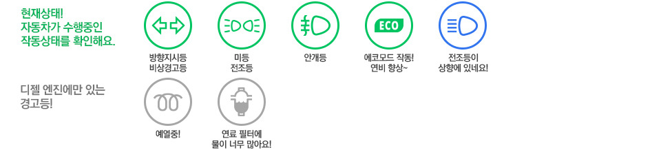 - 디젤 모델에 한해 필터 모양의 주황 아이콘 점등. 20분 이상 70㎞/h 이상 주행하며 매연 필터 자동 연소 유도.