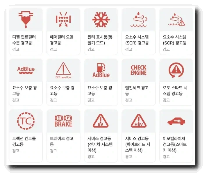 자동차 경고등 종류 총정리 - 현대·기아·쉐보레 말리부·쌍용 편