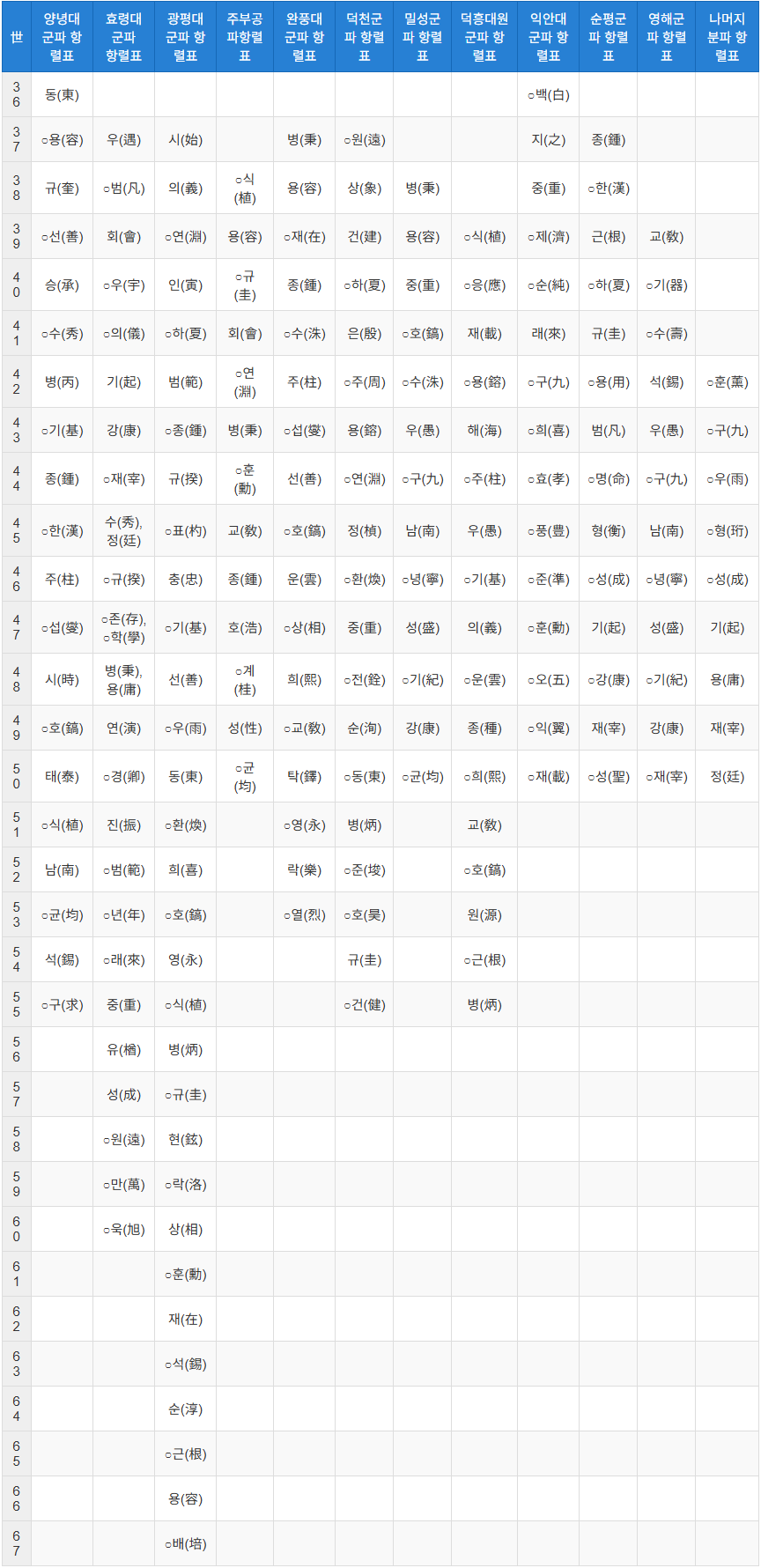 위에 없는 나머지 분파의 항렬표는 아래 목록을 참고하시어 다음의 링크에서 확인하시기 바랍니다.