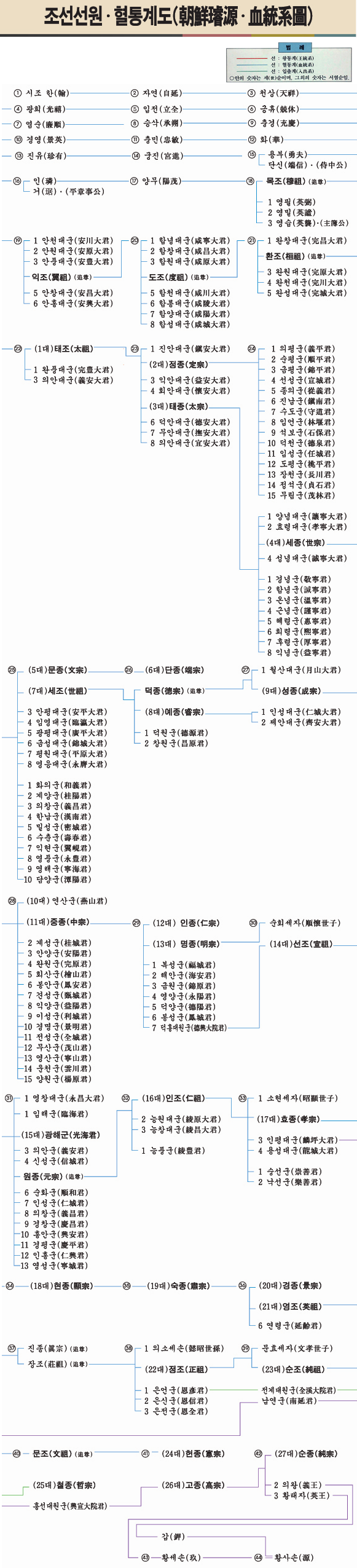 - 왕실 계보 중심: 조선 왕조의 역대 왕과 대군, 군의 계보가 중심.