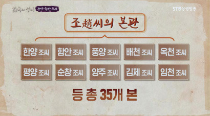 趙 성씨는 고려 개국공신 조선(趙瑄) 이후 급격히 본관 수가 늘어났습니다. 오늘날에는 30여 개 본관이 실재한다는 견해가 우세하지만, 인구의 90% 이상이 아래 여덟 본관에 집중돼 있습니다.