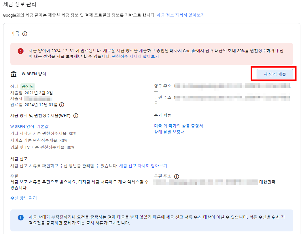 결제 정보 관리 페이지에서 '세금 정보 관리' 섹션을 찾을 수 있습니다. 이 섹션에서는 현재 제출된 세금 정보의 상태를 확인할 수 있으며, 만약 W-8BEN 양식이 만료되었거나 제출되지 않은 경우 이를 업데이트할 수 있는 옵션이 제공됩니다.