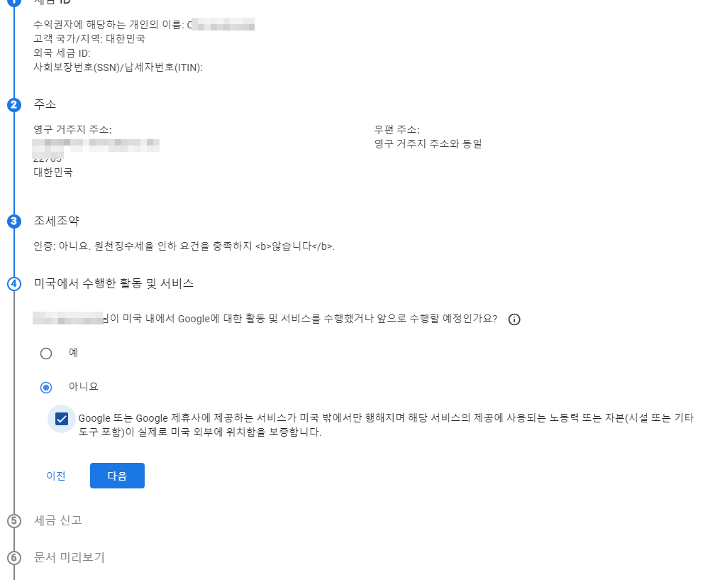 '미국에서 수행한 활동 및 서비스' 항목에서는 미국 내에서 발생한 수익에 대한 정보를 명확히 제공해야 합니다. 대부분의 경우 애드센스를 통해 발생한 수익이 미국 외부에서 발생하므로, 이를 정확히 기입하면 세금 부담을 줄일 수 있습니다.