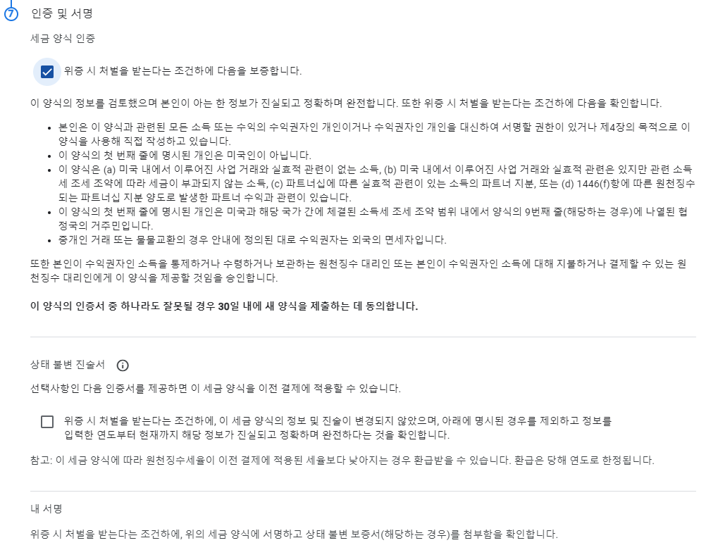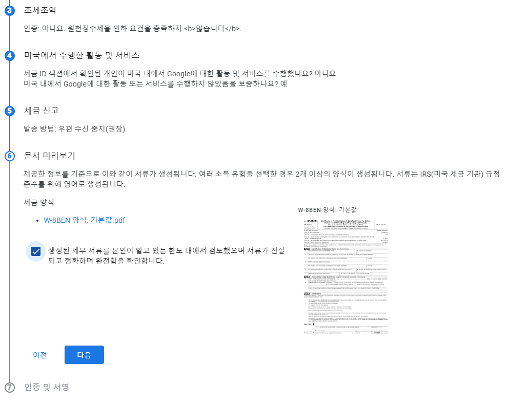 양식 작성 중 '조세 조약 혜택을 신청하시겠습니까?'라는 질문이 나옵니다. 대부분의 개인 사용자는 '아니오'를 선택할 수 있으나, 사업자 등록번호가 있거나 특정 조건을 충족하여 조세 조약 혜택을 받을 수 있는 경우에는 '예'를 선택하여 세금 감면 혜택을 신청할 수 있습니다.