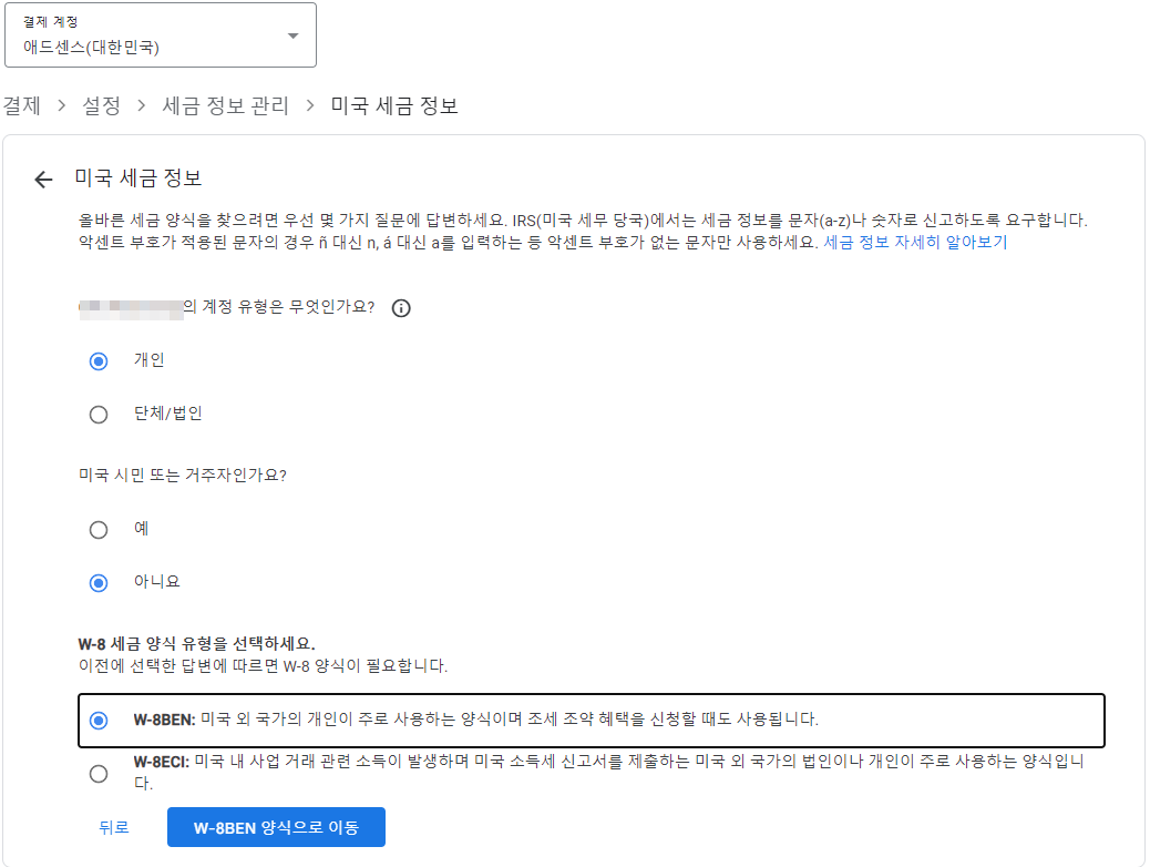 '조치 필요: 애드센스 결제 계정에 확인이 필요한 항목이 있습니다.' 해결방법 -W-8BEN 미국 세금 정보 제출